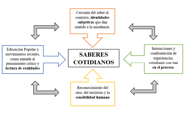 Así pues, permitir el flujo de saberes cotidianos al interior de las prácticas pedagógicas, ayuda a que toda la comunidad educativa se piense desde el conocimiento que se construye y deconstruye a partir de las interacciones mismas y la confrontación de experiencias, donde cada participante tiene voz en el proceso y puede dar cuenta de su origen; valorando de esta manera “las diferentes formas de ser y estar en el mundo que definen la singularidad con el fin de abrir múltiples caminos a la construcción de la identidad, el desarrollo de la autonomía y el despliegue de la creatividad” (Rico & Salazar, 2023, p. 48). Así mismo, se hace imperioso tener presente las identidades subjetivas (Mejía, 2019), ya que estas dan pie a una visión más amplia de colectividad, es decir, de un aprendizaje simultáneo donde se retoma asuntos que son de interés para todos como el medio ambiente, la recuperación - valoración de lo ancestral y la apertura al conocimiento desde múltiples miradas.