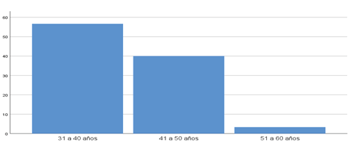 Se observa que según las edades el predominio fue el rango entre 31 a 40 años con 17 (56.7%) seguido del rango de edad entre 41 a 50 años (40%). En relación a la edad, la mayoría del personal médico de consulta externa de la clínica médica previsional tenían un rango de edad de 31 a 40 años, esto coincide con el estudio de López Castro (2022), en el cual reporta que el 33.7% del personal médico de emergencia es entre las edades de 31 a 40 años, así mismo coincide con el estudio de María Lucin, Kenny Escobar y Cristian Arias (2020), donde se reporta que el 46.9% del personal médico se encuentra entre las edades de 30 a 39 años.