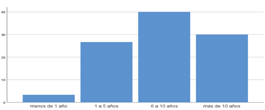 Se observa que 12 (40%), tienen antigüedad de entre 6 a 10 años, así mismo 9 (30%). Tienen antigüedad de más de 10 años. También 8 (26.7%), tienen una antigüedad laboral de entre 1 a 5 años. En cuanto a la antigüedad de predominio en el personal médico fue entre el grupo de 6 a 10 años, el cual coincide con el estudio de López Castro (2022), el cual reporta que el 38.4 % del personal está entre el grupo de 5 a 10 años.