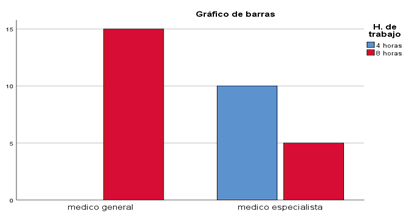 Correspondiente al puesto de trabajo y horas laborales se observa 15 (50%), del personal médico son medico generales que laboran 8 horas, seguido de 10 (33.3%), personal médico especialista que labora 4 horas y 5(16.7%) del personal médico especialista que labora 8 horas. Se observó que el personal médico general es el que cuenta con horario laboral de 8 horas diaria, la cual difiere del estudio María Luncin, Kenny Escobar y Cristian Arias (2020), que reporta que el 46% del personal laboral más de 8 horas diario.