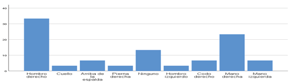 En la relación a la región donde se presenta mayores molestias el (20.0%), refirió tanto en hombro derecho y mano derecha cada uno con una frecuencia en el lapso de tiempo de 2 a 7 días, seguido de 2(6.7%), hombro derecho en el lapso de tiempo de 1ª a 24 horas. Se observó que la región del cuerpo donde presentan molestias y la frecuencia del episodio tuvo predominio tanto el hombro derecho como la mano derecha con frecuencia de 2 a 7 días lo cual no coincide con el estudio de López Freddy (2020) quien reporta que la región lumbar y frecuencia de entre 8 a 30 días.