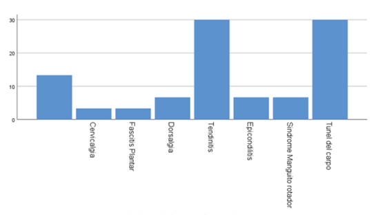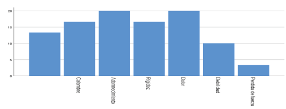 Una cantidad de 6 (20%), del personal médico refería dolor, seguido de 6(20%), del personal médico refería adormecimiento, luego 5 (16.7%), personal médico que refería calambre y 5 (16.7%), refería rigidez. Con respecto al síntoma que mayor refirió el personal médico fue el dolor, este coincide con el estudio de López Castro (2022), donde se reporta que un 86.5% del personal el síntoma que más refiere es dolor.