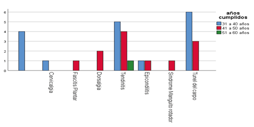 Un total de 17 (56.6%), del personal médico con predominio de rango de edad de 31 a 40 años presentan trastornos musculo esquelético, seguido de 12(40%), del personal médico con rango de edad de 41 a 50 años que presentan trastornos musculo esqueléticos (ver anexo. Tabla 10). En relación al rango de edad con mayor presencia de trastornos musculo esquelético es entre 31 a 40 años. El cual coincide con el estudio de López Castro (2022), que reporta que el 91.4%, del personal entre 31 a 40 años que presentaron trastornos musculo esqueléticos.