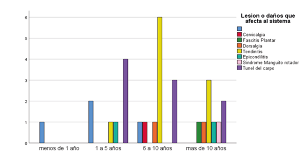 La antigüedad laboral de 10 años es un factor que influye en la aparición de síntomas musculo esquelético, los cuales se asocian a su vez con las dolencias propias del envejecimiento. Es conocido que a mayor tiempo de exposición a cualquier factor de riesgo ergonómico mayor será el daño músculo esquelético causado.