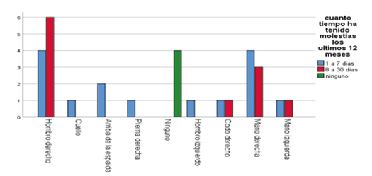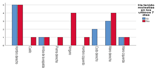 Corresponde 5(16.7%), hombre derecho que si han tenido molestias en los últimos 7 días y 5(16.7%), hombre derecho que no ha tenido molestias en los últimos 7 días, seguido de 4 (13.3%), mano derecho que no ha tenido molestias en los últimos 7 días. Se observa que en referencia a región del cuerpo donde presenta molestias y que si ha tenido molestias en los últimos 7 días el hombro derecho predomino para ambos. Lo cual no coincide con el estudio de López Freddy que no reporta casos de dolor en hombro y presencia de molestias en los últimos 7 días.