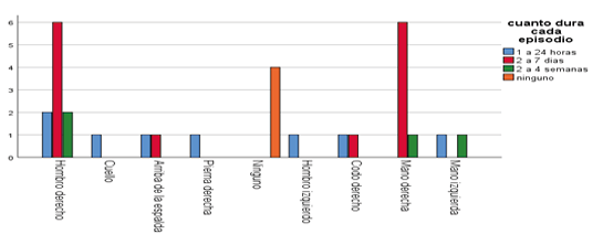 En relación a región del cuerpo donde presenta molestia y cuánto dura cada episodio del personal médico de consulta externa de la clínica médica previsional amistad Japón Nicaragua, Granada.