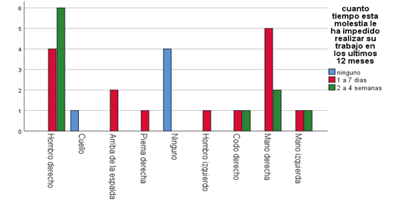 En este grafico se muestra el predominio con 6 (20.0%), el hombro derecho con frecuencia de 2 a 4 semanas impedido para laboral, así mismo 5 (16.7%), mano derecha con frecuencia de 1 a 7 días, así también con 4 (13.3%), hombro derecho con frecuencia de entre 1 a 7 días. Se observó que la molestia en el cuerpo con mayor frecuencia fue el hombro derecho con frecuencia de impedimento de su trabajo de entre 2 a 4 semanas, lo cual coincide con el estudio de López Freddy (2020), quien reporta que la región del hombro en su totalidad (100%), están ubicados entre 1 a 4 semanas.