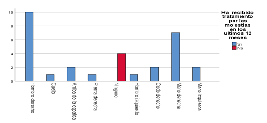 En relación a región del cuerpo donde presenta molestia y si ha recibido tratamiento por las molestias en los últimos 12 meses, el personal médico de consulta externa de la clínica médica previsional amistad Japón Nicaragua, Granada.