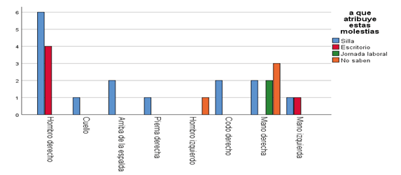 El hombro derecho como región del cuerpo con mayor predominio en el personal médico y dentro de las causas a las que atribuyen estas molestias el mayor factor referido fue la silla seguido del escritorio. Lo cual no coincide con el estudio de López Freddy (2020), quien refiere que el caso de hombro la molestia la atribuyen a mala postura