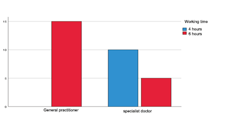 Corresponding to the job position and working hours, 15 (50%) of the medical personnel are general practitioners who work 8 hours, followed by 10 (33.3%), specialist medical personnel who work 4 hours, and 5 (16.7%) of the specialist medical personnel who work 8 hours. It was observed that general medical personnel are those who have a working schedule of 8 hours a day, which differs from the study by María Luncin, Kenny Escobar, and Cristian Arias (2020), which reports that 46% of the labor personnel work more than 8 hours a day.