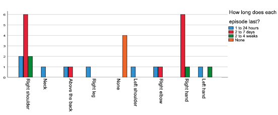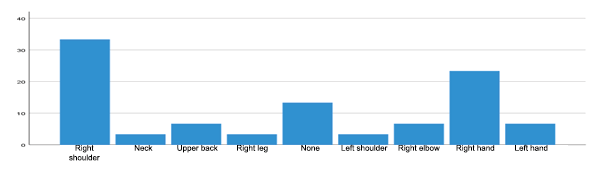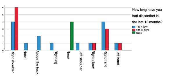 About the region where the greatest discomfort is presented, (20.0%) reported both the right shoulder and the right hand, each with a frequency in the period of 2 to 7 days, followed by 2 (6.7%), right shoulder in the period of 1 to 24 hours. It was observed that the region of the body where they present discomfort and the frequency of the episode had a predominance of both the right shoulder and the right hand with a frequency of 2 to 7 days, which does not coincide with the study by López Freddy (2020) who reports that the lumbar region and frequency of between 8 and 30 days.