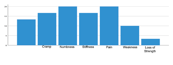 Several 6 (20%) of the medical personnel reported pain, followed by 6 (20%), of the medical personnel reported numbness, then 5 (16.7%), medical personnel reported cramps and 5 (16.7%) reported stiffness. Regarding the symptom that medical personnel reported the most was pain, this coincides with the study by López Castro (2022), where it is reported that 86.5% of the personnel report pain as the symptom that they report the most.