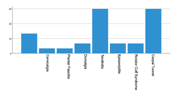 In Graph 8. A total of 10 (33.3%) of the medical staff had shoulder tendinitis as the main musculoskeletal disorder. Followed by 9 (30%) of medical personnel who present carpal tunnel. Shoulder tendonitis was the main musculoskeletal disorder affecting medical personnel. This differs from the study by Jhaira Sánchez (2022), in which she reports that 48% of the staff had low back pain as the main musculoskeletal disorder. It also differs from the study by María Luncin, Kenny Escobar, and Cristian Arias (2020), which reports that 38.8% of the staff has low back pain as the main musculoskeletal disorder.