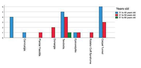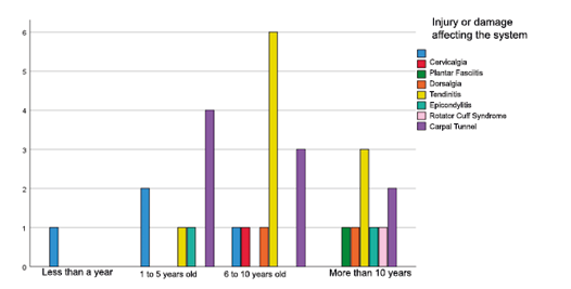 A total of 17 (56.6%) of the medical personnel with a predominance of the age range of 31 to 40 years have musculoskeletal disorders, followed by 12 (40%) of the medical personnel with an age range of 41 to 50 years who present musculoskeletal disorders (see annex. Table 10). The age range with the highest presence of musculoskeletal disorders is between 31 and 40 years old. This coincides with the study by López Castro (2022), which reports that 91.4% of personnel between 31 and 40 years of age presented musculoskeletal disorders.