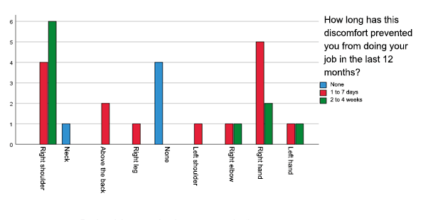 This graph shows the predominance with 6 (20.0%), the right shoulder frequently prevented from working for 2 to 4 weeks, as well as 5 (16.7%), right hand with frequency from 1 to 7 days, as well as with 4 (13.3%), right shoulder with frequency from 1 to 7 days. It was observed that the most frequent discomfort in the body was the right shoulder, frequently impeding work for between 2 to 4 weeks, which coincides with the study by López Freddy (2020), who reports that the shoulder region in its entirety (100%) is located between 1 to 4 weeks.