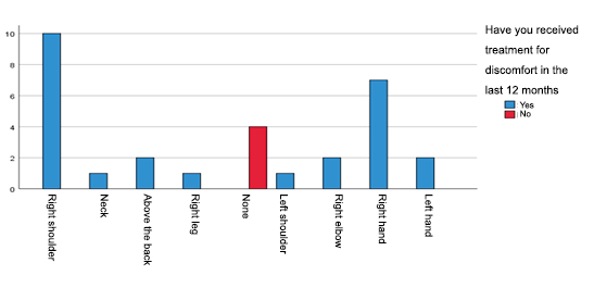 In this graph, 26 (86.7%) of the medical personnel reported discomfort in some region of the body, and 4 (13.3%), medical personnel reported no discomfort. It was also observed that most of the medical personnel presented some discomfort in some regions of the body. It coincides with the study by López Castro (2022), which reports that 86.5% of the surveyed personnel reported discomfort in some region of the body.