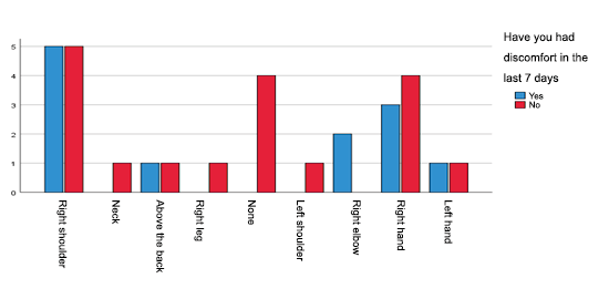 It corresponds to 5 (16.7%), right man who have had no discomfort in the last 7 days and 5 (16.7%), right man who has not had discomfort in the last 7 days, followed by 4 (13.3%), right hand who has not had discomfort in the last 7 days. It is observed that about the region of the body where he presents discomfort and that if he has had discomfort in the last 7 days, the right shoulder predominated for both. This does not coincide with López Freddy’s study, which does not report cases of shoulder pain and the presence of discomfort in the last 7 days.