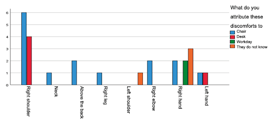 The right shoulder is the region of the body with the greatest predominance in medical personnel and among the causes to which they attribute these discomforts, the greatest factor referred was the chair, followed by the desk. This does not coincide with the study by López Freddy (2020), who states that in the case of shoulder discomfort is attributed to poor posture