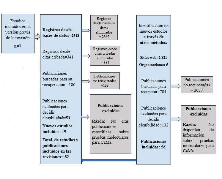 Se revisaron 356 artículos científicos, identificándose 186 sobre pruebas genómicas y genéticas para CaMa, de los cuales se incluyeron 25 por su relevancia al tema, siete de ellos identificados en revisiones previas y 19 encontrados en esta revisión. Se revisaron 2,821 sitios web, seleccionando 56 publicaciones web para incluirse en la sistematización.