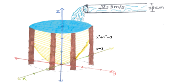 A continuación, la siguiente representación gráfica de la estructura de un tanque en forma de un paraboloide elíptico, el cual está siendo llenado por un líquido (agua) que circula por una tubería: en la vida cotidiana de los seres humanos se ve a diario cuando se pone a llenar una pila, tanques o cualquier otro envase, y surgió la incógnita de la velocidad de él agua, cuánto tiempo tardará un envase en llenarse, etc.