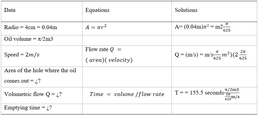 The two unpublished problems solved in the previous pages refer to fluids contained in large containers in the form of elliptical paraboloids, of which it was necessary to calculate their density, but it was necessary to calculate other variants (area of the tube through which the fluid came out, volume of the tank, volumetric flow and the mass of the liquid). These variants are calculated with equations found in the theoretical reference and other formulas that are widely used such as: (cylinder volume and circle area) then the conclusion of the problem was reached by calculating the density and thus solving objective two (applying concepts and formulas in unpublished problems).