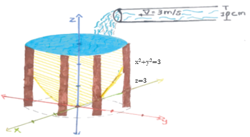 Below is the following graphic representation of the structure of a tank in the form of an elliptical paraboloid, which is being filled by a liquid (water) circulating through a pipe: in the daily life of human beings it is seen daily when a battery, tanks or any other container is filled. and the question arose of the speed of the water, how long it will take for a container to fill, etc.