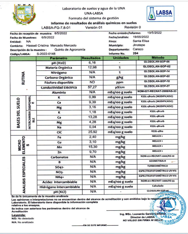 El estudio arroja resultados muy significativos, cálculos de la cantidad de nitrógeno total y nitrógeno disponible; La valoración parte del 12.98 % MO que presenta el estudio de suelo.
