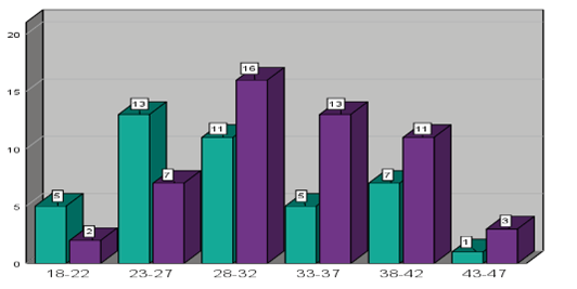 El grupo de edad más afectado fue el de 28-32 años con 27 trabajadores, predominando con 16 casos el sexo femenino, seguido del grupo de 23-27 años con 20 casos, de los cuales 13 fueron del sexo masculino y los de 33-37 años con 18 casos, mayormente afectados 13 casos del sexo femenino, el grupo de 43-47 años en el caso del sexo masculino es el menos afectado con 1 caso.