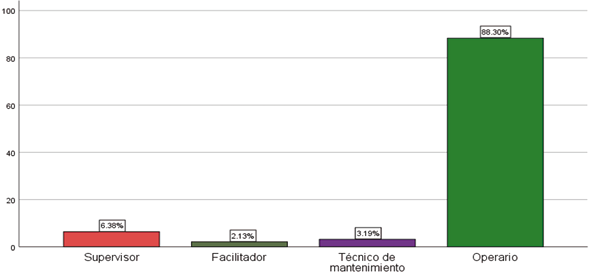 Las ocupaciones según el perfil más afectados fueron personal operario con 83 casos (88.3%), seguido de los supervisores con 6 casos (6.4%), técnicos de mantenimiento con 3 casos (3.2%) y facilitadores con 2 casos (2.1%).