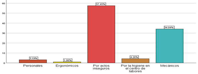 Los factores de riesgos que con mayor frecuencia se presentaron para la ocurrencia de los accidentes fueron los actos inseguros con 54 casos (57.4%), seguidos por los mecánicos con 32 casos (34%), las condiciones de higiene en el centro de labores siguen el orden con 4 casos (4.3%), concluyendo con los factores personales y ergonómico con 3 (3.2%) y 1 (1.1%) caso respectivamente.