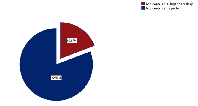 Los accidentes registrados, fueron de trayecto con 76 casos (80.85%), seguido de los accidentes de tipo laboral con 18 casos (19.15%).