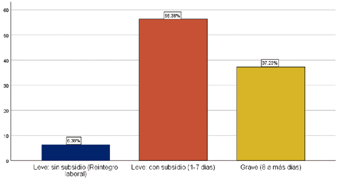 Según la gravedad del accidente, las afectaciones fueron de tipo leve con subsidio en 53 casos (56.4%), con incapacidad laboral de 1-7 días, seguido de accidentes graves con 35 casos (37.2%) incapacidad de 8 a más días, leve sin subsidio 6 casos (6.4%) con tratamiento y reintegro inmediato.