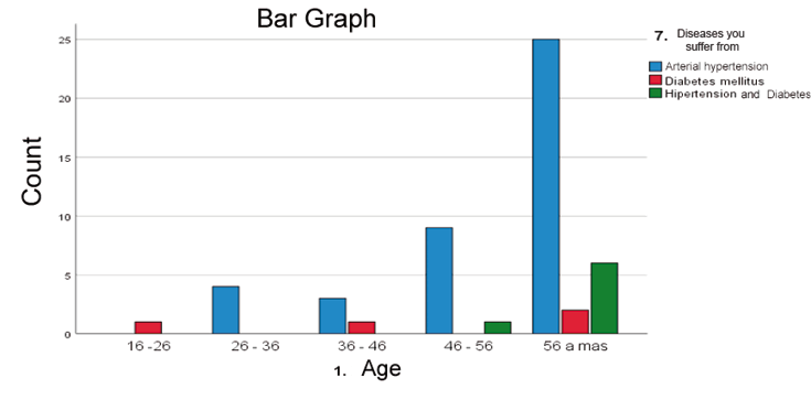 According to the age of the patients studied, statistically it was found that the largest number of patients diagnosed with high blood pressure and diabetes mellitus are adults over 56 years of age, with a frequency of 33 patients studied belonging to this group.