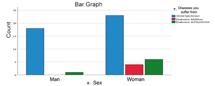The sex most affected are women: of the total of 52 patients diagnosed with high blood pressure and diabetes mellitus, 63% are equivalent to 33 women and 37% are equivalent to 19 men.
