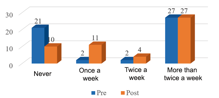 According to the level of frequency with which the patients studied performed physical exercises before the intervention, we found that 51.9% exercised more than twice a week, while 40.4% never exercised and after the intervention, 19.2% never exercised, there was a significant change of 21.2% started exercising once a week.