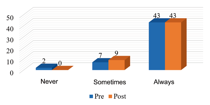 The level of frequency with which the patients studied drank water before the intervention shows that 27 of the 52 patients drank 4-8 glasses of water daily, 17 sometimes and 6 frequently, and after the intervention, there was a significant change that 14 patients sometimes drink 4-8 glasses of water daily and 9 patients frequently.