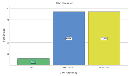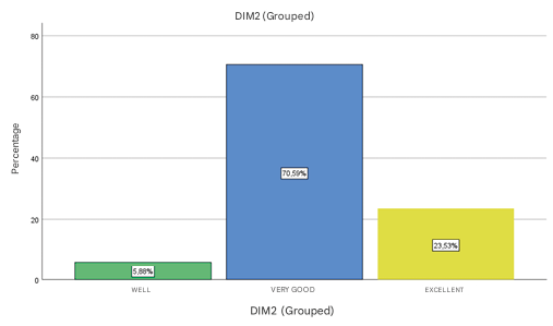 To have an assessment by the dimensions, the variables DIM1, DIM2, and DIM3 were calculated, which are obtained by calculating the means of the scores assigned by the students in each of the items or indicators of the dimension, then we proceeded to group and categorize these means, establishing the categories of deficient, Average, Good, Very Good and Excellent. Figure 6 shows that 47.06% of the students consider their experience with the applied strategy to be very good and excellent, this is corroborated by what was expressed by the teachers involved in the study who, like them, value the strategy very well since they managed to show very positive results in terms of motivation. Teamwork, interest in research, and mastery of the mathematical concepts studied.