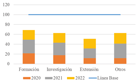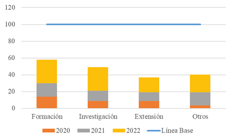 Gráficamente se evidencia que, del 100 % de convenios marcos firmados entre 2020 y 2022, hubo un 70% en el proceso clave de Formación para el año 2020, un 62% aportaba en investigación, 50% en extensión y 62% en otros rubros como donaciones y equipamiento. En relación a los convenios específicos, del 100%, el 59% aportaba a Formación, 50% a Investigación, 38% a Extensión y un 40% a otros rubros como donaciones y equipamiento.