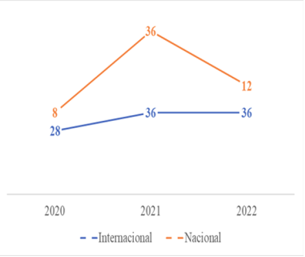 Como se logra observar en el tema de convenios internacionales se presenta un incremento del 28% al 36% de los convenios firmados en el transcurrir de los años, sin embargo, en el tema de convenios nacionales se observa que para el 2021 hubo un 36% de convenios firmados y ejecutados, disminuyendo este porcentaje para el 2022 con un 12%, pero es importante rescatar que el nivel de aprovechamiento fue realmente satisfactorio.