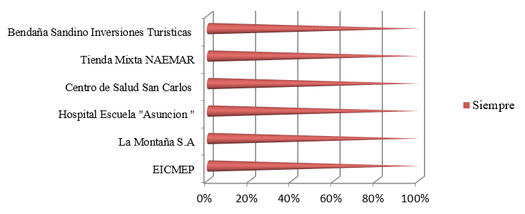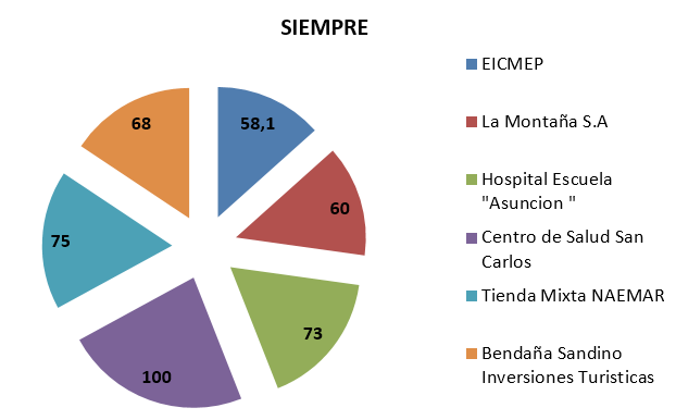 El reflejo de un clima organizacional agradable y cultura de paz se visualiza en el gráfico No. 6, donde los colaboradores manifestaron que siempre están satisfechos en su desempeño laboral en dichas empresas e instituciones.