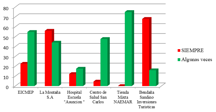 Es notorio que no siempre se aplica la remuneración extrafinanciera tanto en las empresas como instituciones, en el gráfico No. 3 se visualiza en promedio, que el 43% algunas veces los colaboradores reciben esta remuneración extrafinanciera, 27% siempre lo recibe, dejando claro que la remuneración extrafinanciera es un elemento que ejerce mucha incidencia en los colaboradores, sin embargo no todas las organizaciones incorporan este tipo de beneficio y no por eso, estos expresan inconformidad.