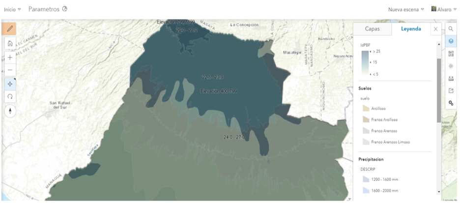 2. La segunda consistió en el desarrollo de las bases de datos georreferenciadas de los municipios de Carazo que para su implementación en el sistema de información, esta se ejecutó con la digitalización de los mapas en el programa ArcGis 10.3 y luego el alojamiento en un servicio web de ArcGis Online. Los mapas temáticos que se alojaron en esta plataforma son: precipitación, elevación, temperatura y tipos de suelos.