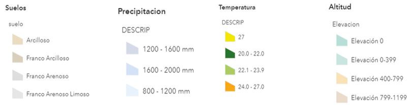 En cuanto a la información de los mapas temáticos era necesario digitalizar: precipitación, elevación, temperatura y tipos de suelos, cabe recalcar que la información del pH del suelo y la humedad son necesarias pero no se cuenta con mapas, por esta razón estos parámetros se introducen manualmente.
