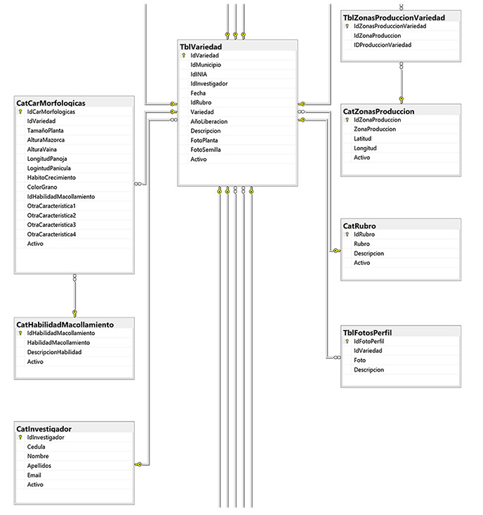 3. La tercera etapa consistió en la implementación de la base de datos relacional de las tecnologías de granos básicos, datos que fueron obtenidos en la primera etapa, en el departamento de Carazo utilizando Microsoft SQL Server, Visual C# y Entity Framework que según MicroSoft, (2019), permite a “los desarrolladores trabajar con datos en forma de objetos y propiedades específicos del dominio como clientes y direcciones de clientes sin tener que preocuparse de las tablas y columnas de base de datos subyacentes donde se almacenan estos datos”, siendo esta combinación una herramienta de programación, siempre tomando en consideración los principios y estándares de web-forms, donde se utilizó el Lenguaje de Modelo Unificado (UML), basado en el Paradigma de la Programación Orientada a Objetos (POO) que centra la importancia de los procesos en el adecuado diseño de las estructuras de datos y por otra parte promueve la reutilización efectiva de software y facilita la escalabilidad del software en función de nuevas demandas del contexto.