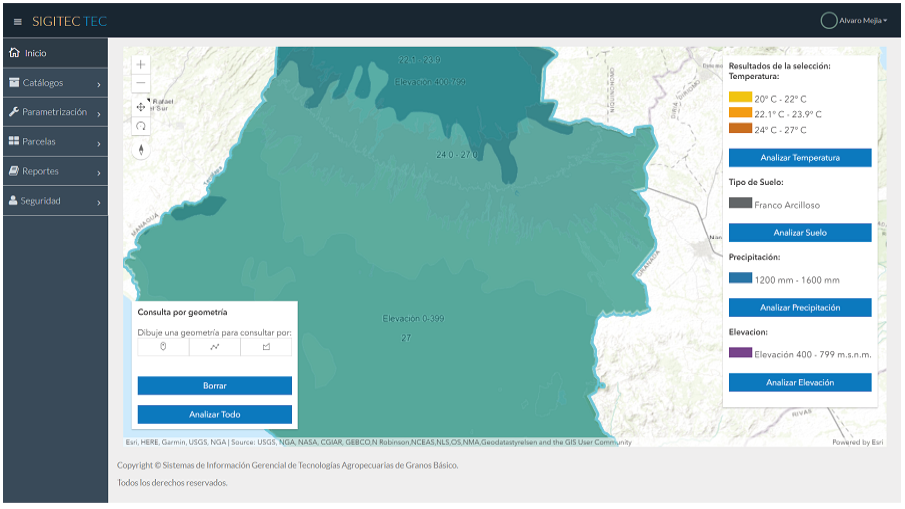 Se presenta la creación de un sistema de información gerencial1 de las variedades disponibles de granos básicos georreferenciadas en Carazo liberadas por el Instituto Nicaragüense de Tecnología Agropecuaria (INTA), entre los años 2007 y 2015, que contribuye en gran medida a la gestión de información de estas. Desarrollado por la Unidad de Investigación y Desarrollo Tecnológico de la Facultad Regional Multidisciplinaria de Carazo (FAREM-Carazo), con apoyo de los Fondos para Investigación (FPI) de la UNAN-Managua; que permite ingresar información de las características, ubicación geográfica y análisis de idoneidad de las parcelas con respecto a las variedades de granos básicos. La investigación dio como resultados: el análisis de los requisitos del sistema, las alternativas para la digitalización de los mapas de temperatura, precipitación, altitud y tipo de suelos del departamento de Carazo, también la disposición de los mapas, así como la elección de una alternativa de tecnología de análisis, diseño, desarrollo e implementación con componentes sólidamente estructurados. Este producto permite la gestión eficiente de las variedades y el análisis en tiempo real de la condiciónes biofísicas de las parcelas para la determinación de cuales variedades de granos básicos son adaptables a dichas, haciendo uso del Lenguaje de Programación C# y la plataforma ArcGis Online para el manejo y administración de mapas de manera automática.