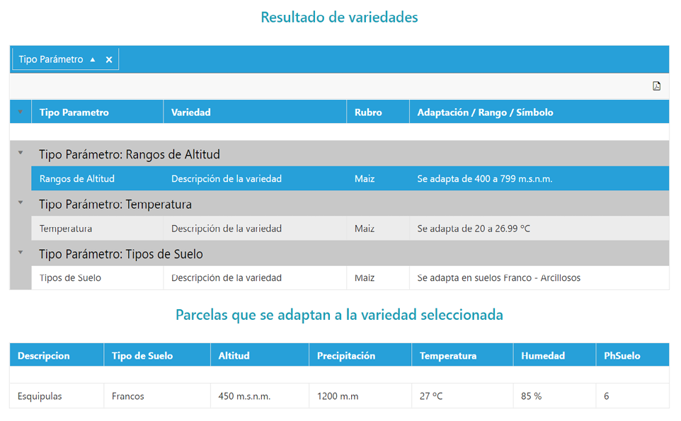 Parámetros Biofísicos a los que se adapta la variedad: Rangos de altitud sobre el nivel del mar (m.s.n.m), Tipos de suelos (francos, limosos, arcillosos, arenosos y las derivaciones de cada uno de ellos), Precipitación pluvial (mm de lluvias caídas sobre una zona), Temperaturas (en C°), Humedad Relativa (%), pH del suelo.